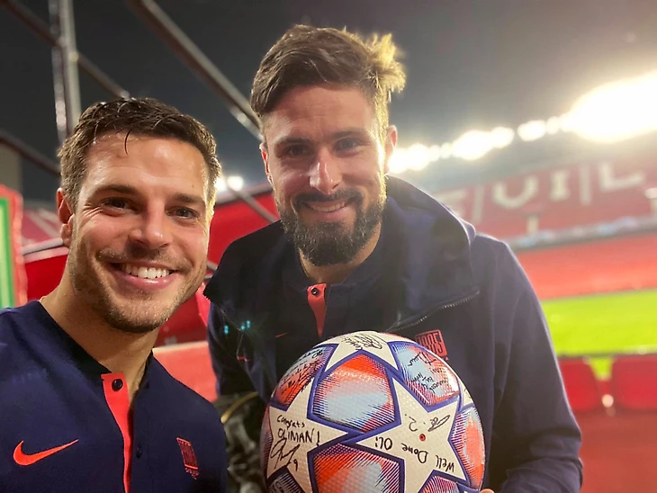 После матча Оливье сиял, фотографируясь с памятным мячом.