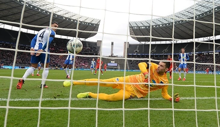 6. Руне Ярстейн из «Герты» очень хотел спасти свои ворота от пятого гола. Не получилось: возвращался на линию слишком быстро и не успел среагировать на удар – в итоге только занес мяч в ворота.