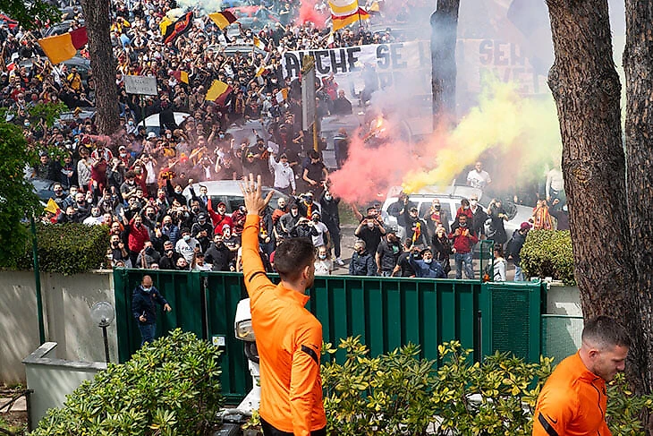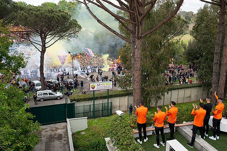 Фаны из Curva Sud у тренировочной базы развернули целую демонстрацию: флаги, плакаты с Даниэле де Росси.