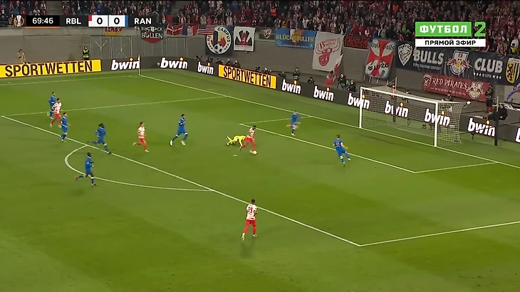 В параллельном матче «РБ Лейпциг» долго не мог пробить «Рейнджерс». Даже великолепный Кристофер Нкунку не забивал из убойных положений – на 70-й минуте француз вышел один на один, обвел вратаря, но пробил выше ворот.