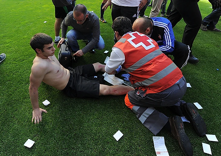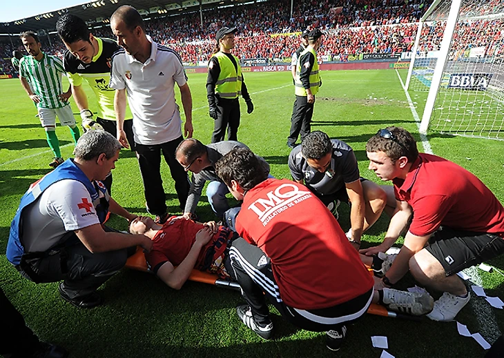 Футболисты помогают пострадавшим на стадионе в Памплоне