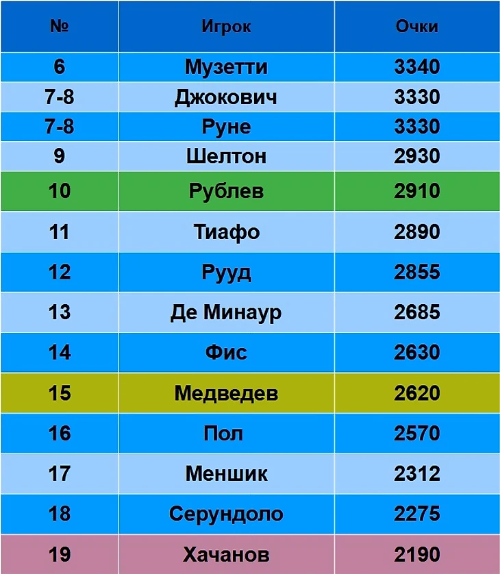 300 очков до 8-го места у Медведева, 380 у Рублева. Причем, Пол еще и на этой неделе играть будет…