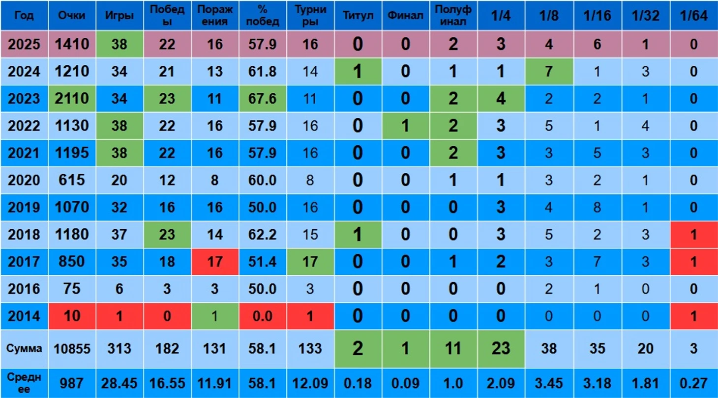 Читать таблицу следует так: Хачанов набрал после Уимбилдона-25 1410 очков. Провел 38 игр, одержал 22 победы, уступил в 16 встречах, процент побед – 57.9. Сыграл 16 турниров. Титулов не брал, в финалы не выходил. 2 раза проиграл в полуфинале, 3 раза уступил в четвертьфинале, 4 раза вылетел в одной восьмой. 6 раз проиграл в 1/16, 1 раз уступил в 1/32.