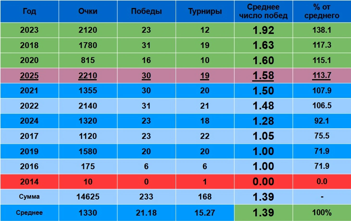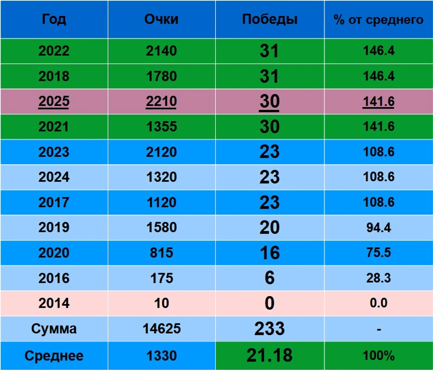По итогам года, лучший 2018 - 46 побед. 2024 - 37, 2023 - 34, 2022 - 36, 2021 - 35, 2019 - 30.