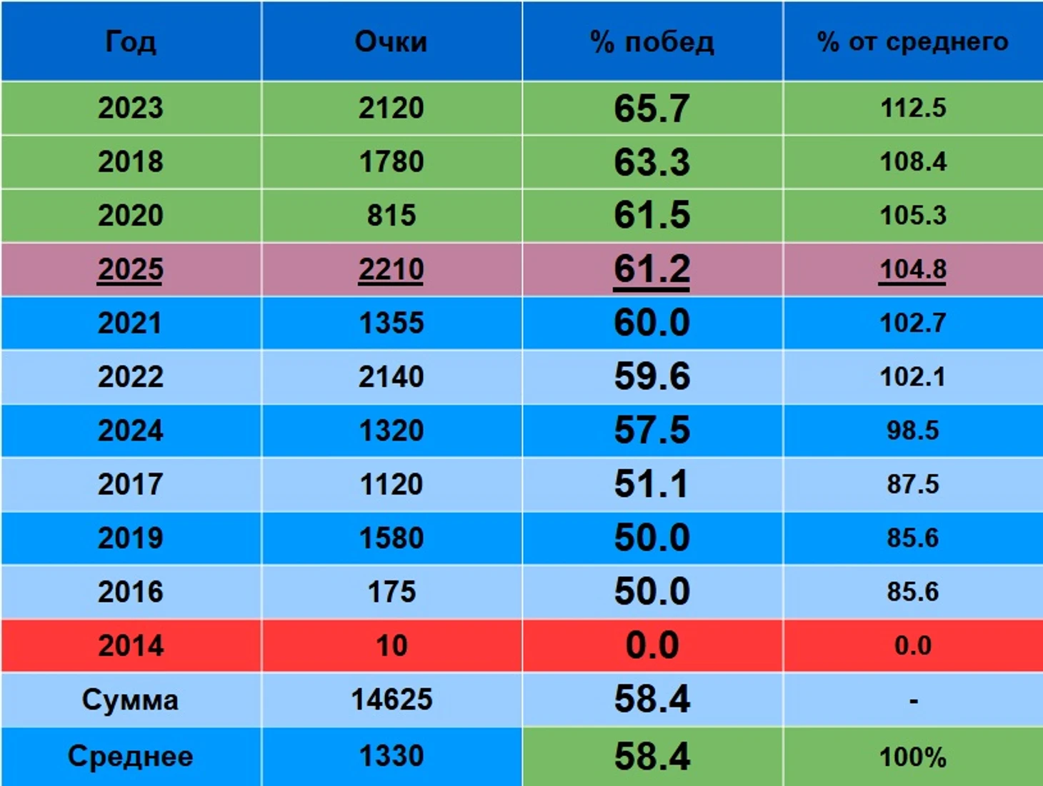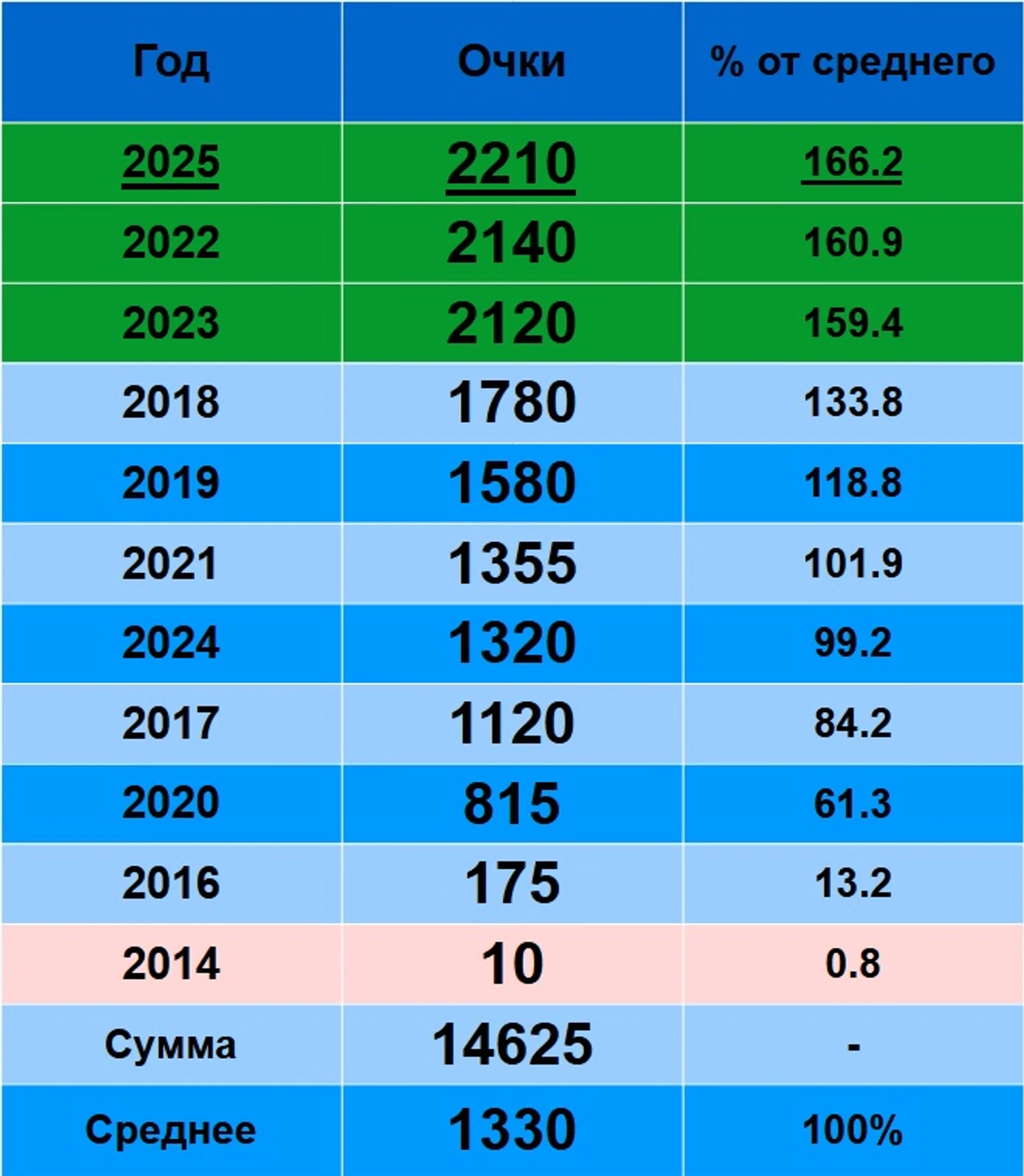 Очки за 2014 – 2023 пересчитаны по современной системе начислений.