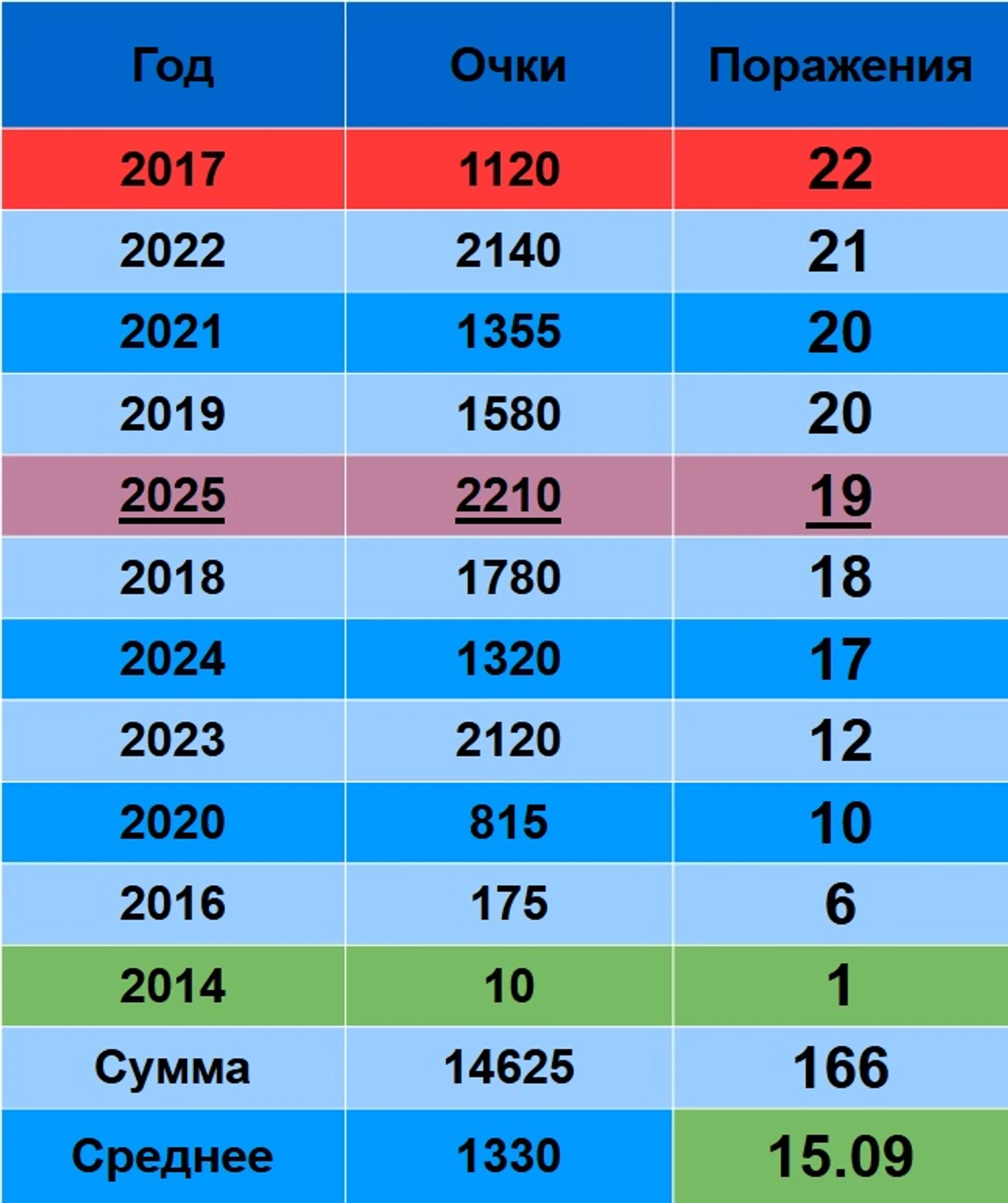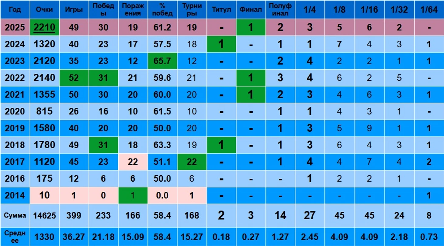2025 сейчас выглядит более-менее нормально. На 4 поражения больше, чем в среднем по карьере. Однако, если отбросить 2014 год с 1 поражением, то среднее было бы уже 16.5 поражений - и 19 поражений выглядят не так уж страшно.