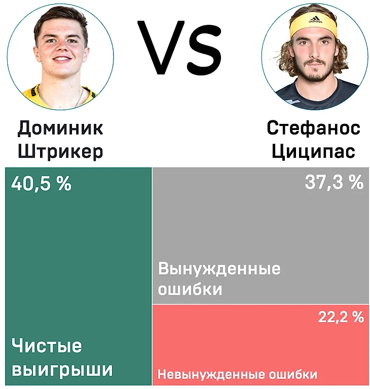 Таким матчем стала игра молодого Доминика Штрикера и не блещущего результатами в последние месяцы Стефаноса Циципаса. В потрясающем по накалу пятисетовом матче с тремя тай-брейками теннисисты провели 367 розыгрышей, из которых чистыми выигрышами завершились 150 очков, из них 33 эйса, а невынужденные ошибки были зафиксированы всего в 82 очках, из них всего 12 двойных.