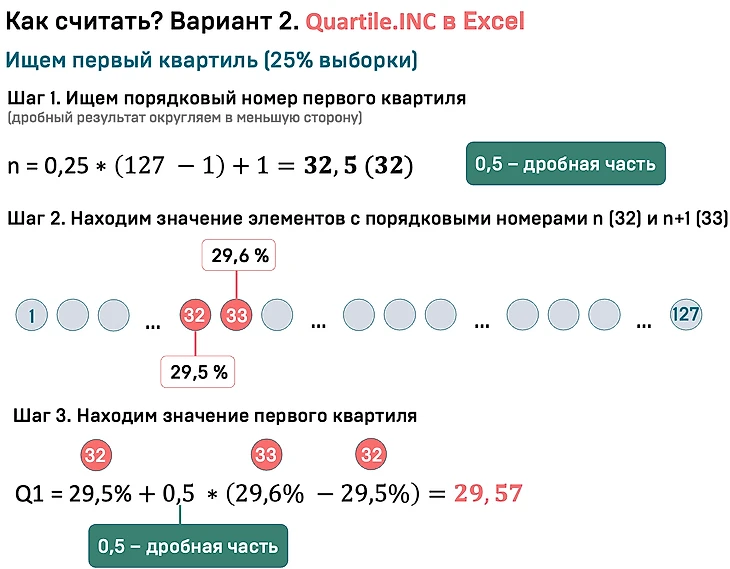 Теперь немного скучной, но полезной информации о том, как же найти значение любого квантиля (перцентиля, дециля, квартиля). Сделать это можно парой разных способов. Основное отличие расчета в том, что в одном случае (QUARTILE.EXC в Excel) из набора данных исключаются максимум (100 перцентиль) и минимум (0 перцентиль), а в другом, наоборот, они включены (QUARTILE.INC в Excel).