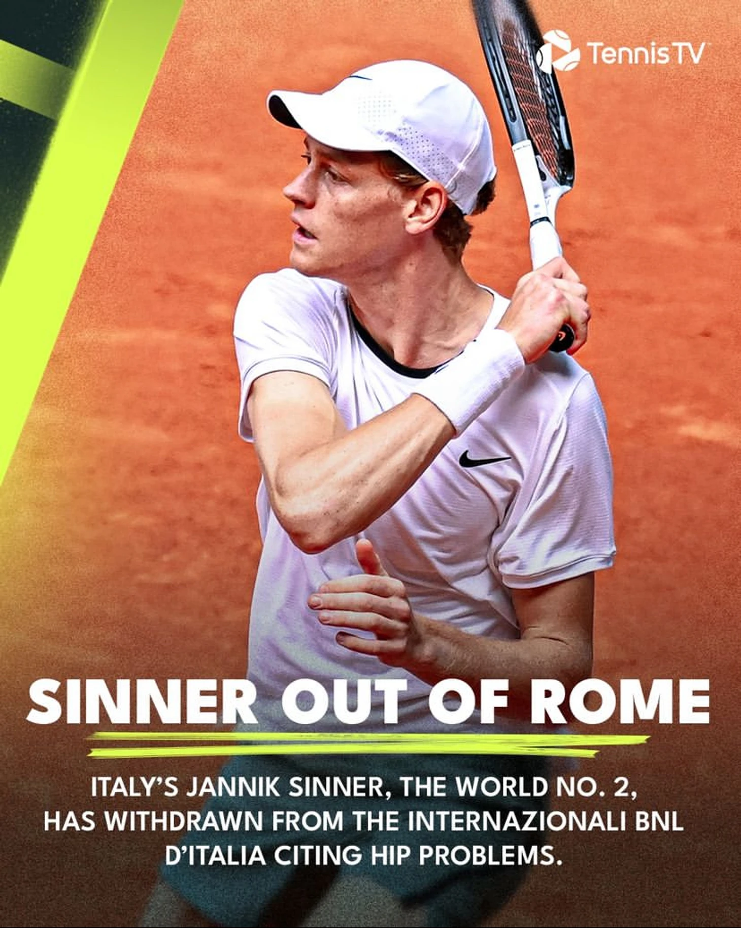 Дискомфорт в бедре мешал Синнеру ещё с третьего круга, поэтому его отказ перед четвертьфинальным матчем с Альяссимом вполне логичен, ведь приоритеты итальянца и его команды были устремлены в сторону домашнего турнира в Риме, на котором, в этом году, мы Янника не увидим, о чём он написал сегодня у себя в твиттере.