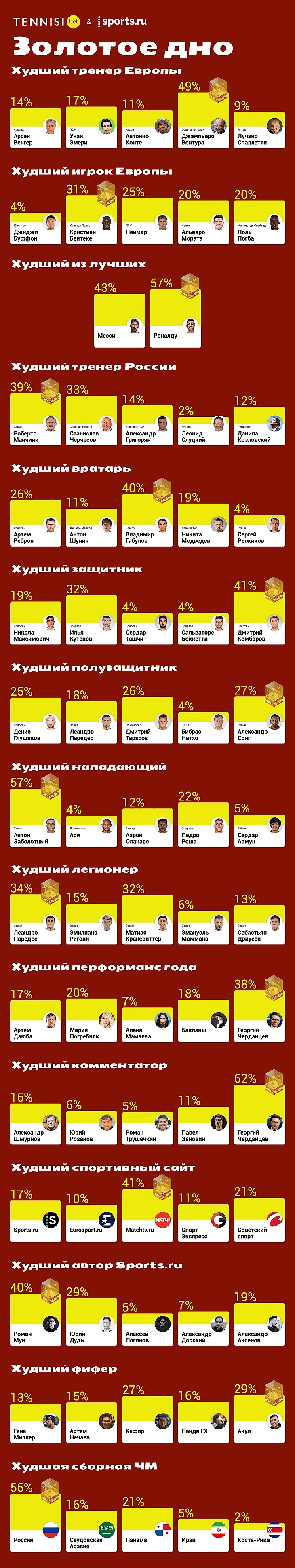 Бакланы, Черданцев, гламурные жены футболистов, Дзюба, Манчини, Венгер, Мун, Дудь – кто совершал самые дикие поступки в минувшем футбольном сезоне? За этих ребят вы голосовали в главной премии года – «Золотое дно-2018».