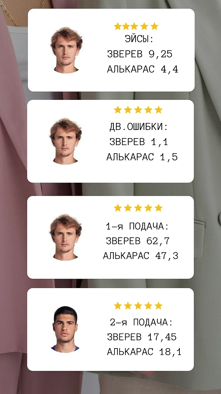 Александр Зверев: 8-1 (88%), 194-99 (66%).