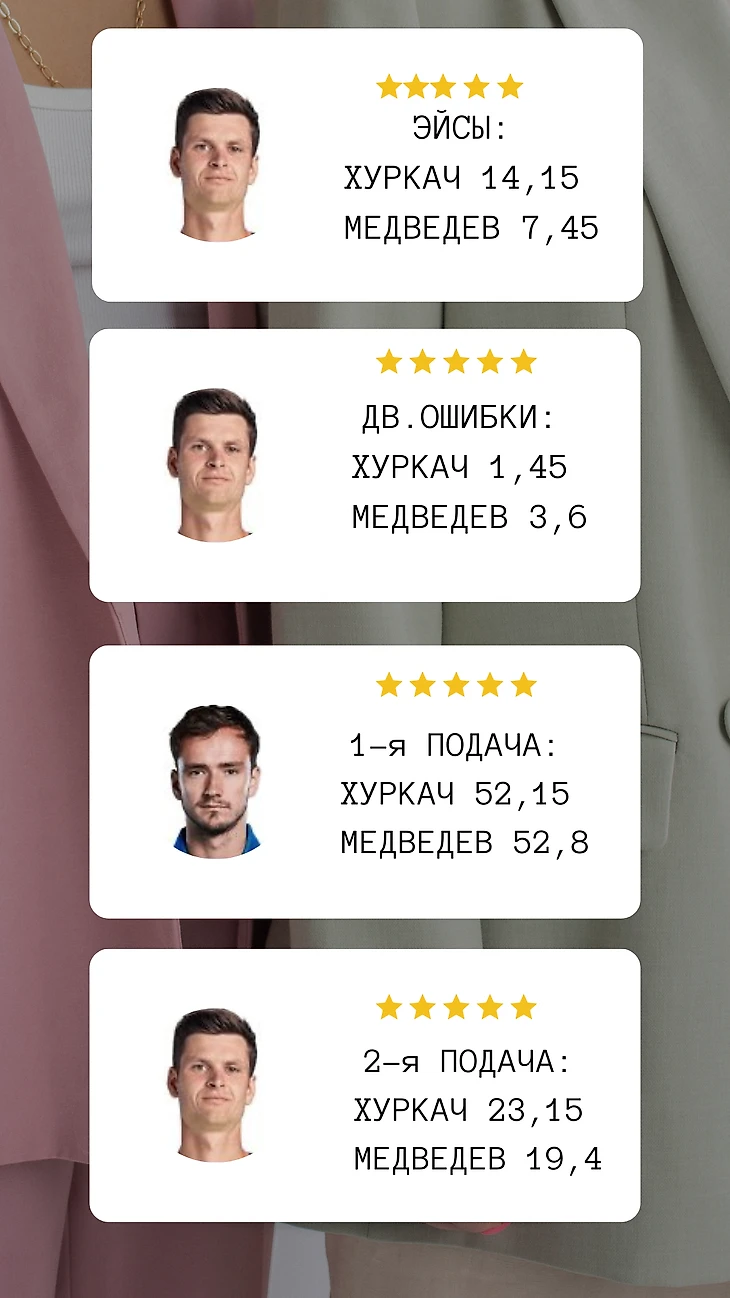 Даниил Медведев: 4-0 (100%), 223-70 (76%).