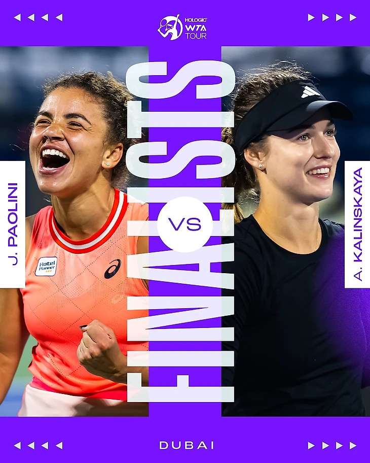 Этим вечером в финальном матче женского турнира в Дубае встретятся Анна Калинская и Жасмин Паолини. Россиянка всю неделю показывает отличную игру, она дошла до финала в качестве квалифайера. На пути к финалу она победила первую и третью ракетки мира Игу Швентек и Коко Гауфф. Жасмин Паолини в 1/2 стадии финала вышла на отказе своей соперницы Елены Рыбакиной, где выиграла путёвку в финал у Сораны Кырсти.