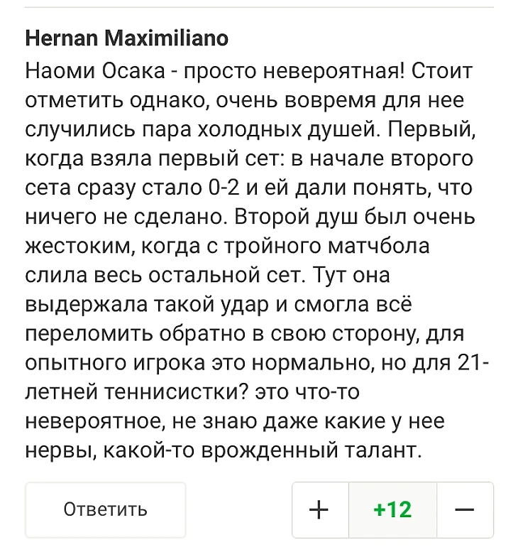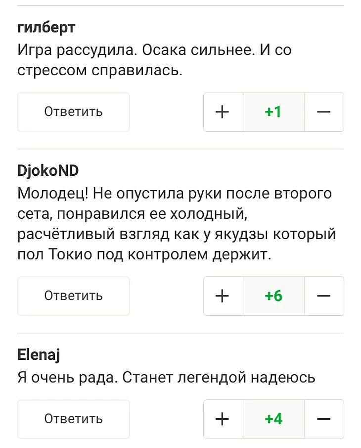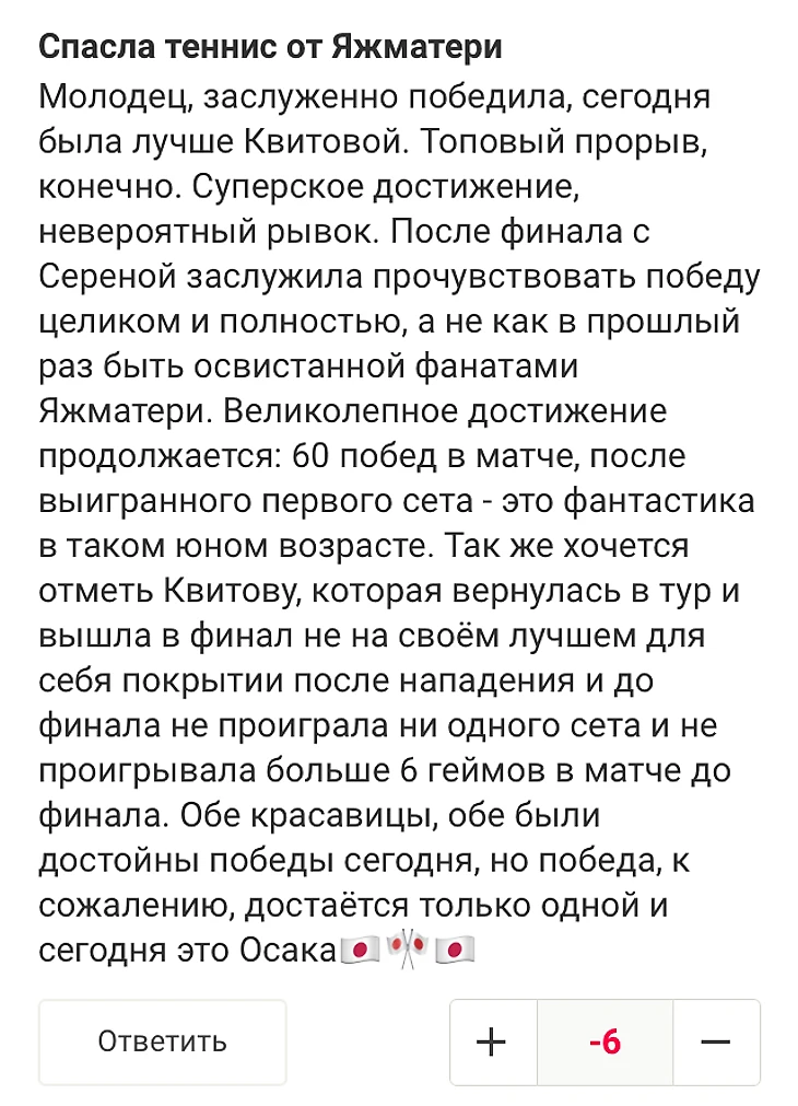 А в понедельник Наоми впервые в карьере станет первой ракеткой мира. Просто чума! Пользователи Трибуны в комментариях только и делают, что радуются победе японки и восхищаются девушкой.