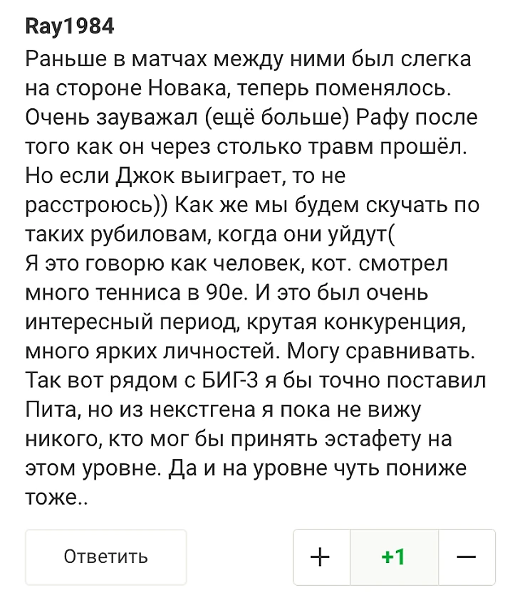Если Джокович победит, то он выиграет третий «Большой шлем» подряд, 15-й в карьере и обойдет Сампраса. Тогда до Рафы ему будет всего два «Шлема», а до Федерера – пять.