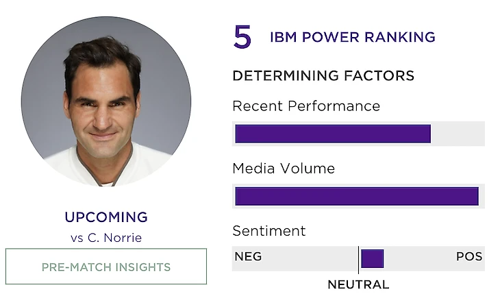 Нововведение этого года – система Power Ranking и предматчевый анализ от «Уотсона». Power Ranking – это ежедневно обновляемый рейтинг игроков по силе, который рассчитывается на основе хода и результатов последних матчей, позиции в рейтинге (но по ходу турнира она влияет все меньше) и даже публикаций об игроке в медиа за последнее время. Ежедневно следить за изменениями в рейтинге очень залипательно, но в то же время система крайне непрозрачна, и логику ее решений часто приходится додумывать. Например, «Уотсон» аномально любит Роджера Федерера – после тяжелой победы на отказе соперника в первом круге Роджер взлетел в Power Ranking на третье место, впереди только Джокович и Медведев. Это можно объяснить огромным медийным весом Роджера и типично позитивной интонацией по отношению к нему в СМИ, хотя это и мало что может сказать о силе Федерера в моменте.