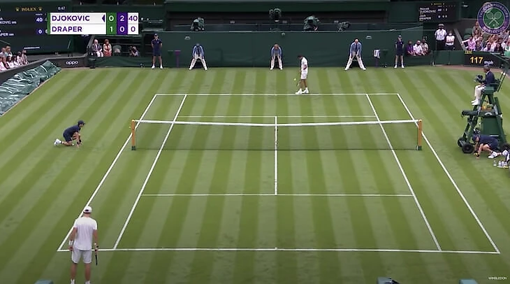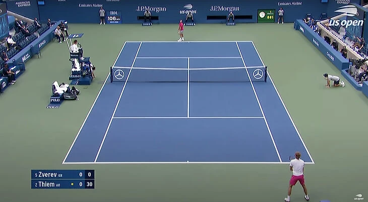 Консервативность «Уимблдона» проявляется и в том, как спонсоры представлены на кортах во время трансляций. Вот два скриншота: первый круг Джоковича на Центральном корте в 2021-м и прошлогодний финал US Open между Тимом и Зверевым. У «Уимблдона» вокруг корта всего два логотипа – мельчайшие брендинги мячей Slazenger и смартфонов OPPO, у американского мейджора – 12 спонсорских лого плюс еще один на сетке, причем каждый из них гораздо читабельнее, чем изображения на главной арене «Уимблдона». На остальных кортах травяного «Шлема» логотипы вообще черные на темно-зеленом фоне, разобрать их с экрана смартфона очень сложно. Все это, очевидно, не способствует росту стоимости спонсорских контрактов.