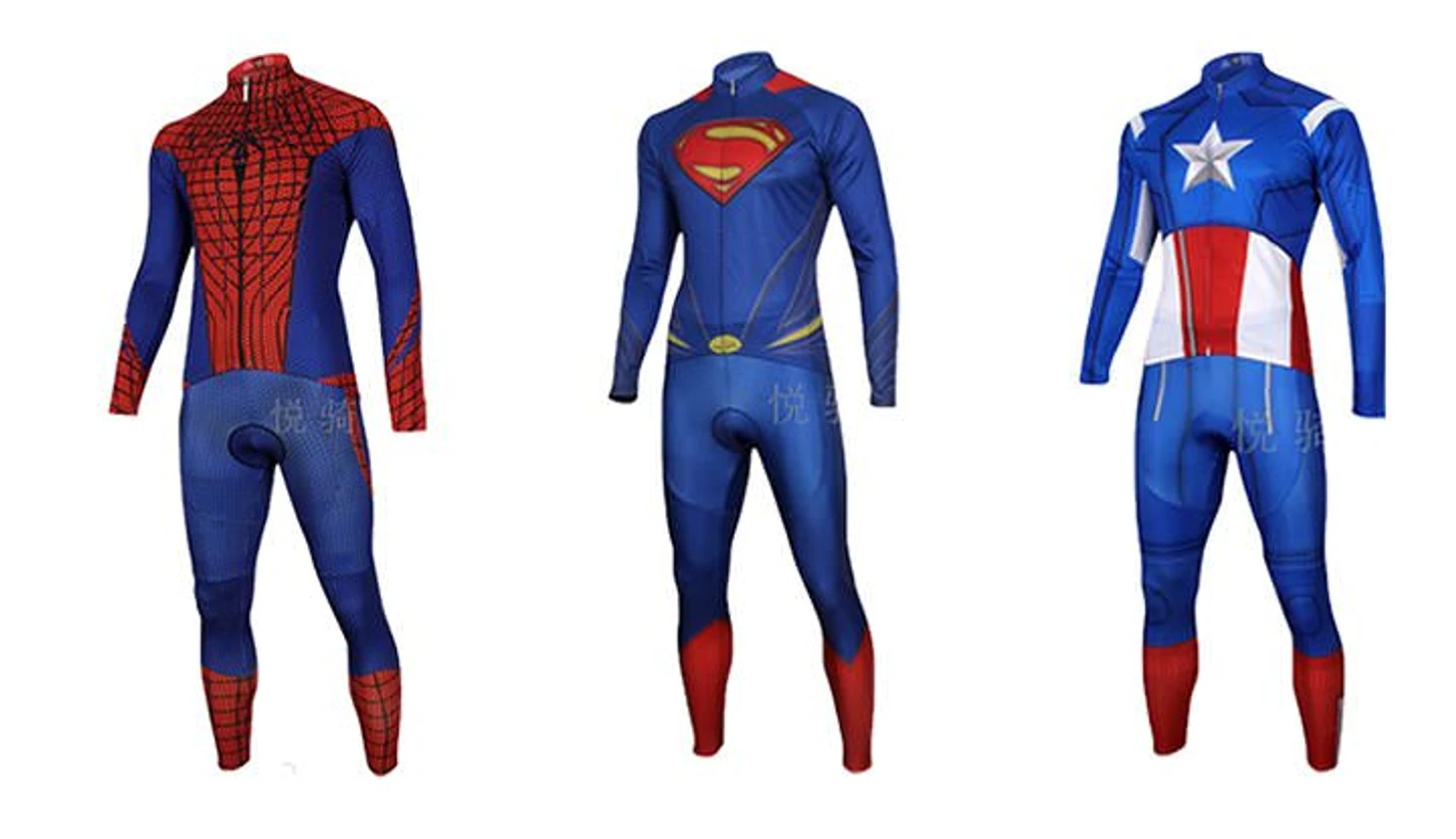 Крутая и яркая одежда для велопокатушек. Почувствуйте себя настоящим спасителем человечества рассекая по дороге в костюме Супермена, Человека-Паука или Капитана Америки.