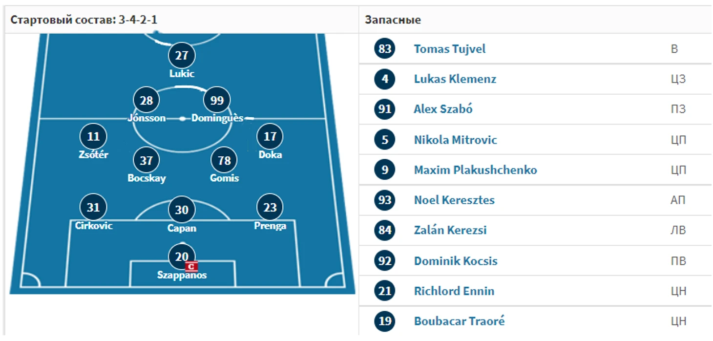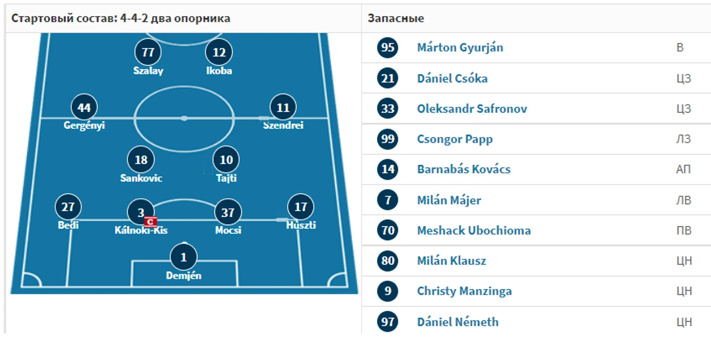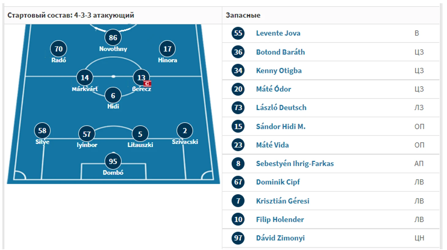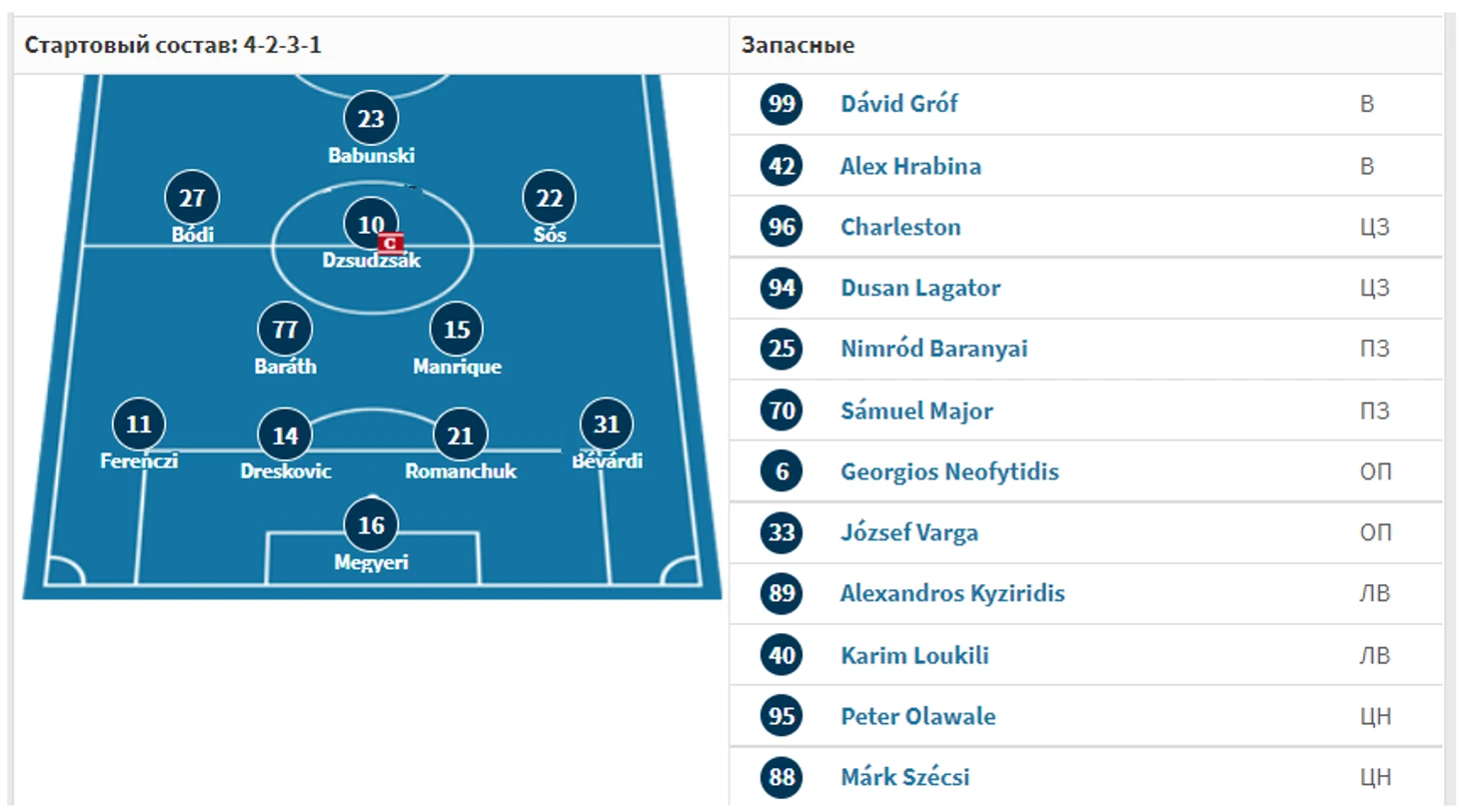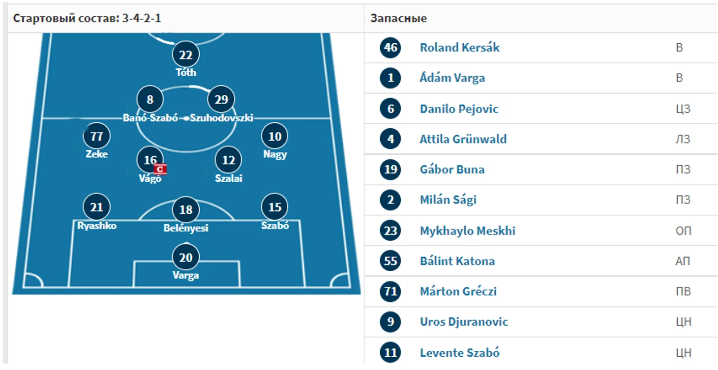 А вот тренер этой команды может быть известен тем, уто болеет за «Зенит» и «Айнтрахт». Сабольч Хусти. Для Венгрии это один так скажем представителей ленд новой эпохи, человек, поигравший во множестве клубов своей венгерской страны, Франции, Германии, Китая и России. Как тренер он только начинает свой путь и 39 лет для этого поприща совсем немного. Всего же благодаря «Фехервару» и «Дебрецену», как у тренера у него накопилось 34 игры с 15 победами, а значит и их 44%.