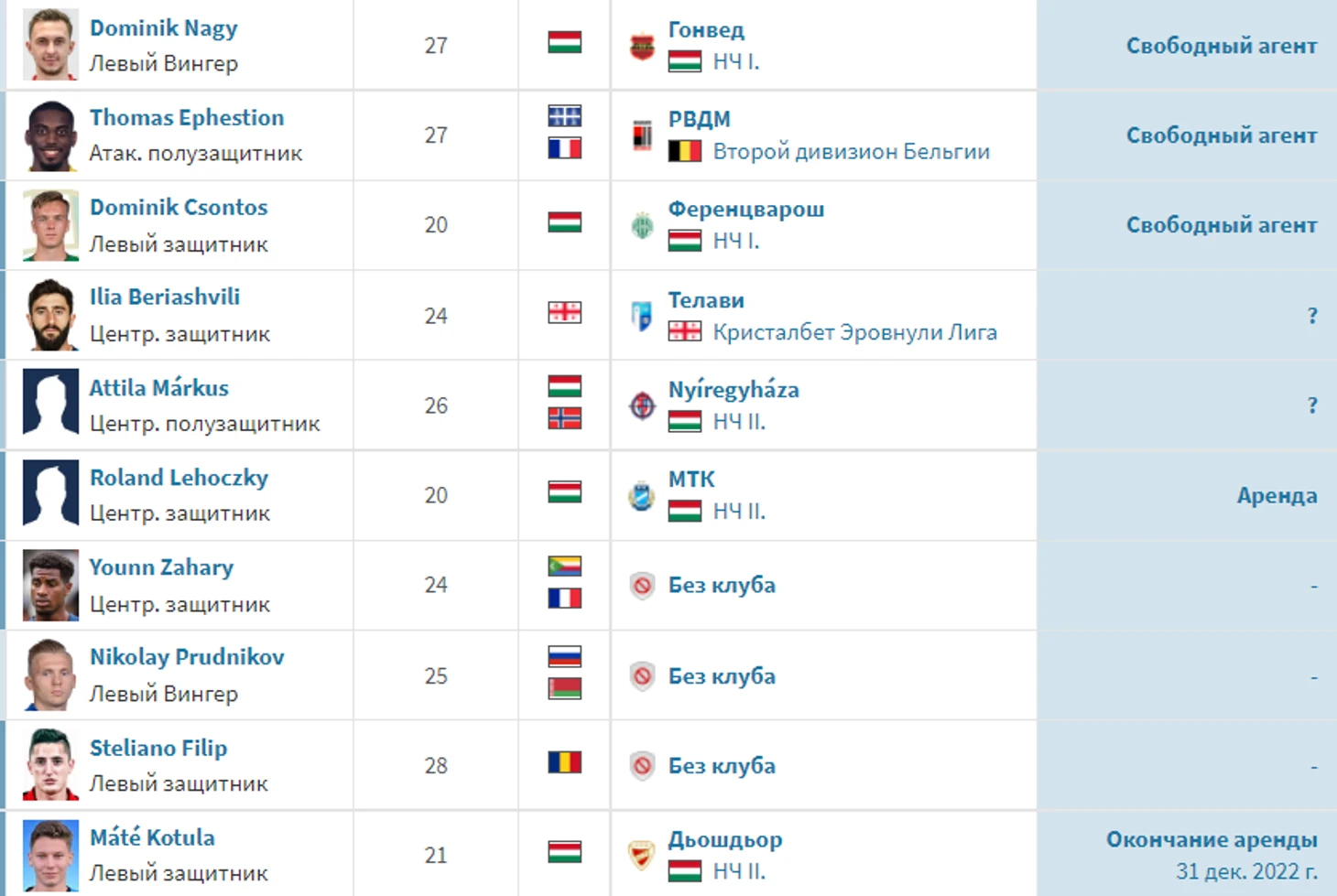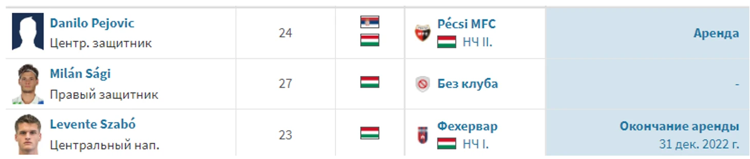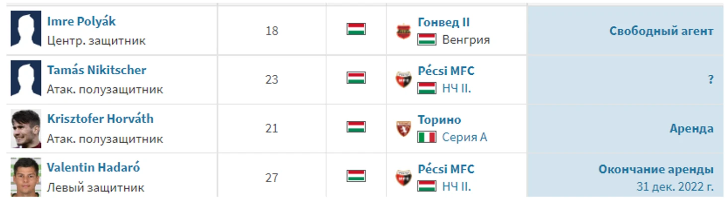 Этой зимой команду пополнили и покинули исключительно игроки с венгерским паспортом. Пришли 4. Это СА Аттила Харис, которому сейчас 25 лет, а его игровое амплуа центральный полузащитник или кратко ЦПЗ. Взят в аренду 19-летний вратарь Джозеф Балажс. Ну и вернулись из аренд ещё двое. Правый защитник Николас Ковач 23 лет. Ну и 21-летний атакующий полузащитник Патрик Саммер.