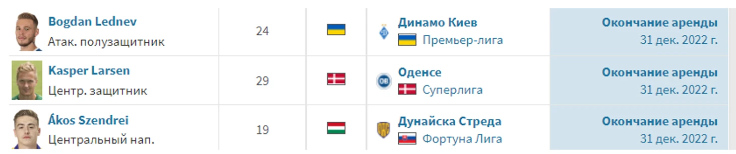Покинули же команду двое и все по истечению сроков арендных соглашений. Украинец Богдан Леднёв, возрастом 24 года и позицией на поле атакующего полузащитника. Ну и венгр 19 лет, ЦН, Акош Сендрей.