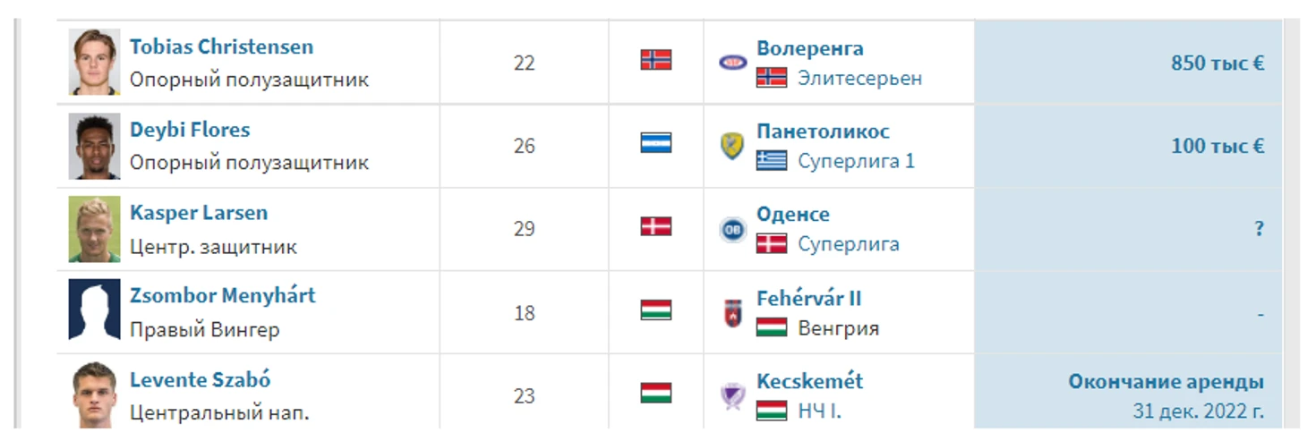 Тут поменьше трансферов, так что текст возвращается. В команду пришли выкупленный датчанин Каспер Ларсен 29 лет, ЦЗ, САа также 2 венгерских молодых игрока. 23-летний ЦН Сабо Левенте и 18-летний правый вингер Жомбор Менихарт. За 850 тысяч евро приобрели норвежского ОПЗ Тобиаса Кристенсена 22 лет. А ещё за 100 тысяч лет был приобретён гондурасец ОПЗ Дейби Флорес, которому уже 26 лет.