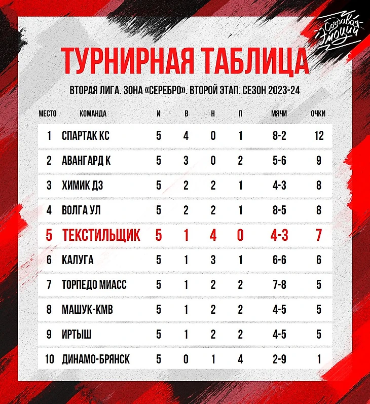 После 5 сыгранных матчей «Текстильщик» располагается на 5 месте в турнирной таблице. Примечательно,что клуб из Иваново пока единственный,кто ни разу не проиграл. С другой стороны с победами дела обстоят не лучшим образом.Всего один матч завершился победой, 9 марта на выезде со счетом 1-2 был обыгран клуб «Торпедо» из города Миасс.
