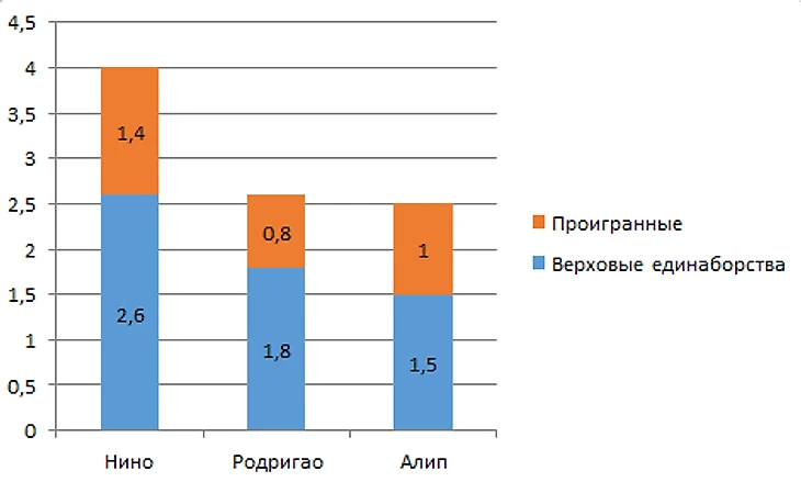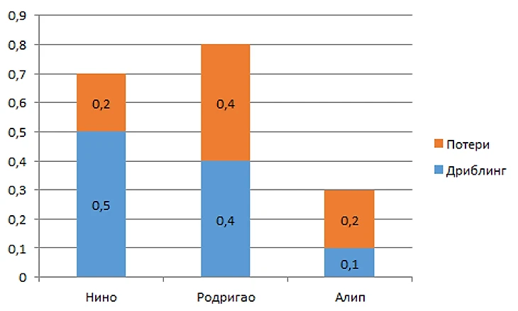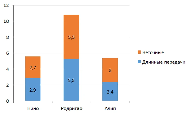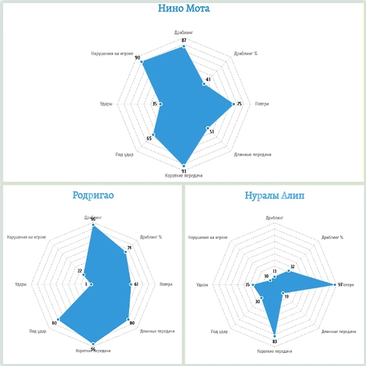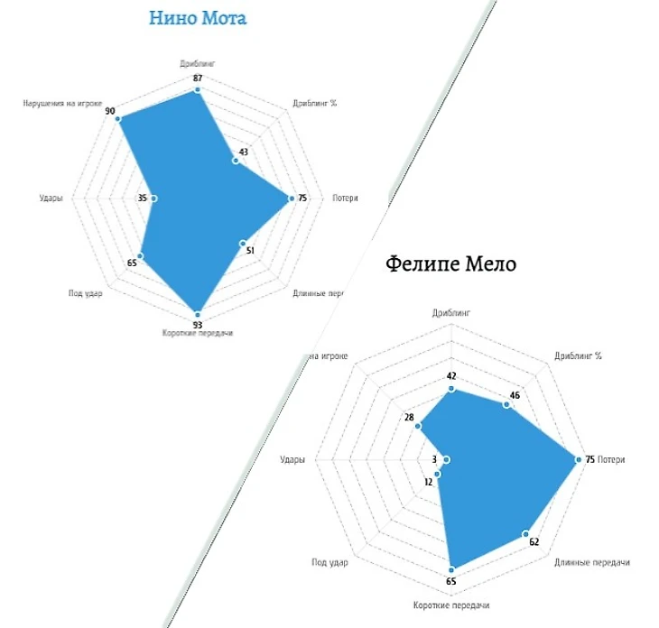 Все атакующие показатели Нино выше, за исключением Длинных передач 2,9 против 3,1 у Мело. Как у показатели тепловых карт, именно Нино располагался выше в атакующей фазе.