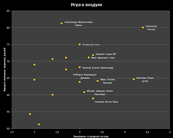 Диаграмма соотношения успешных верховых единаборств среди центральных защитников РПЛ