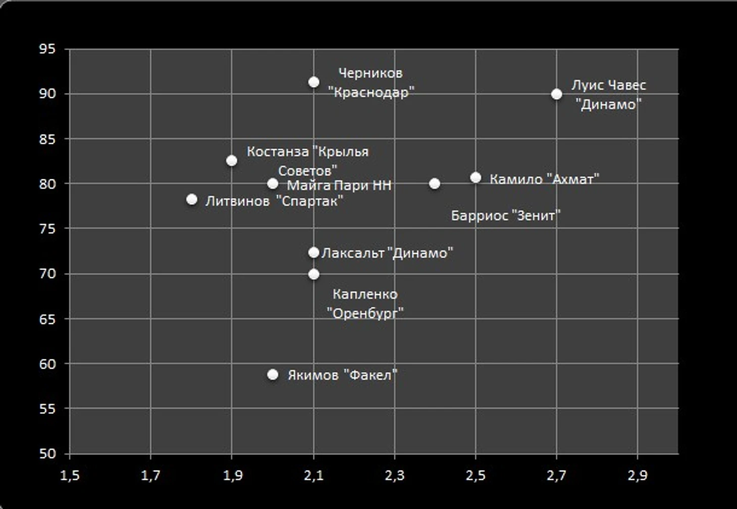 График показателей 10 лучших центральных полузащитников нашего Чемпионата