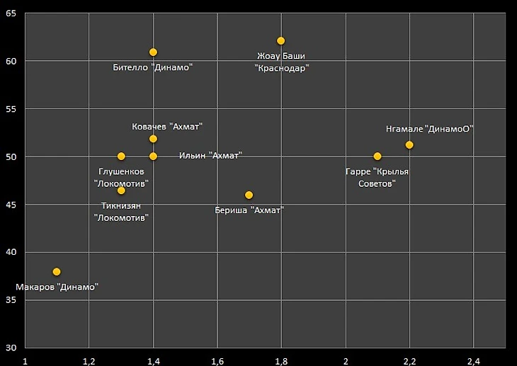 ТОП Атакующих полузащитников РПЛ по обводкам и передачам под удар