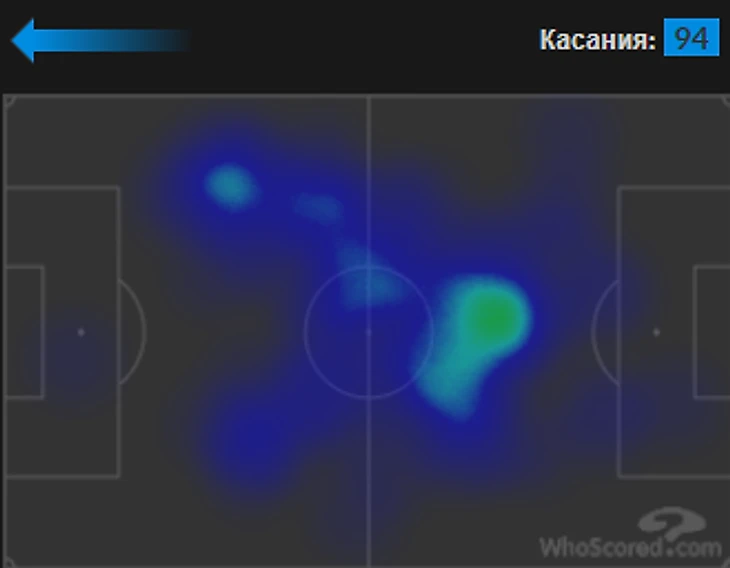 Номинально игрок находится ближе всех к чужим воротам. Средняя позиция футболиста в матче с «Кристал Пэлас»