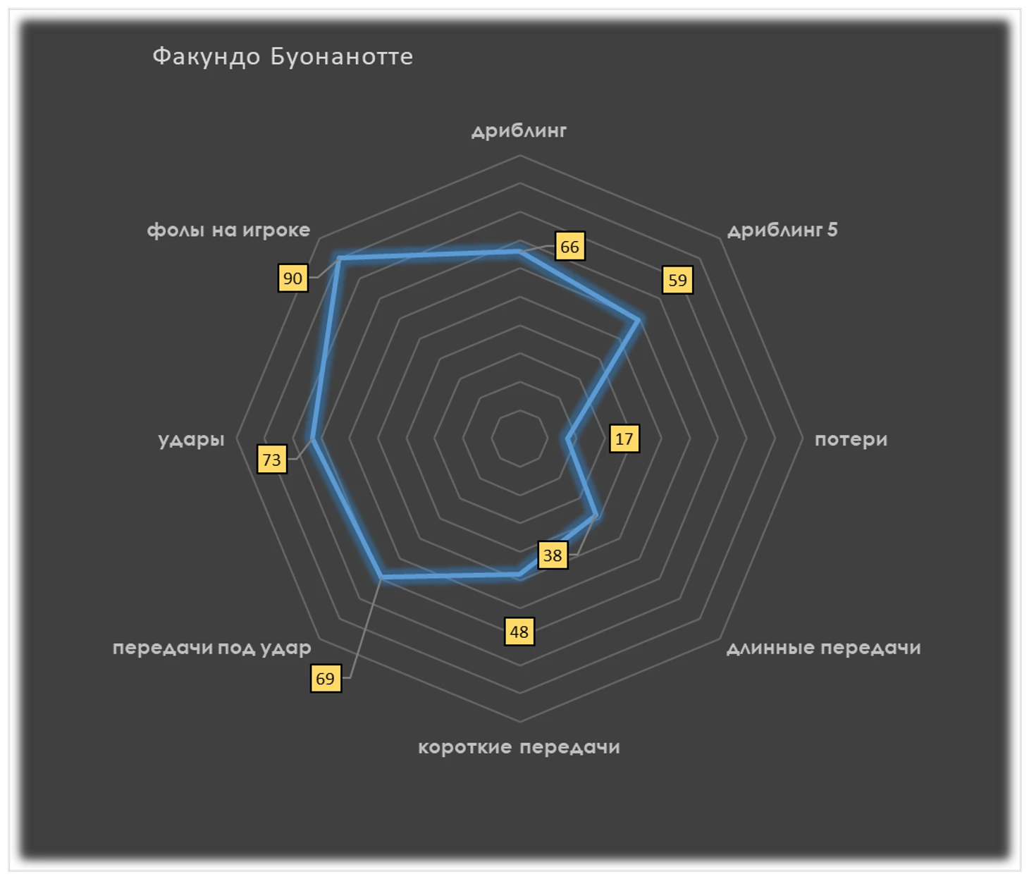Показатель игрока будем рассматривать посредством диаграмм и графиков, где показатель 60, будет означать, что игрок лучше 60% футболистов на этой позиции. Выборка состоит из 30 лучших атакующих полузащитников, проведших не менее 6 игр в нынешнем сезоне.