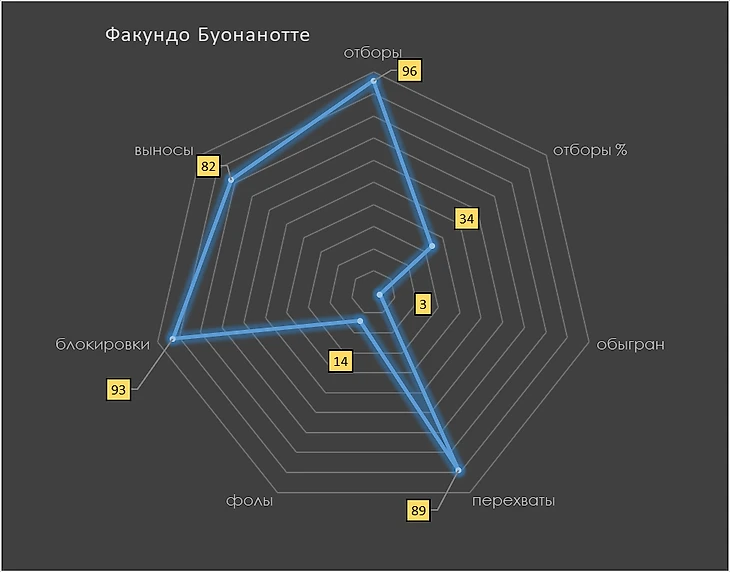 Отборы - 3,2 в среднем за игру (лучший результат среди атакующих полузащитников АПЛ).
