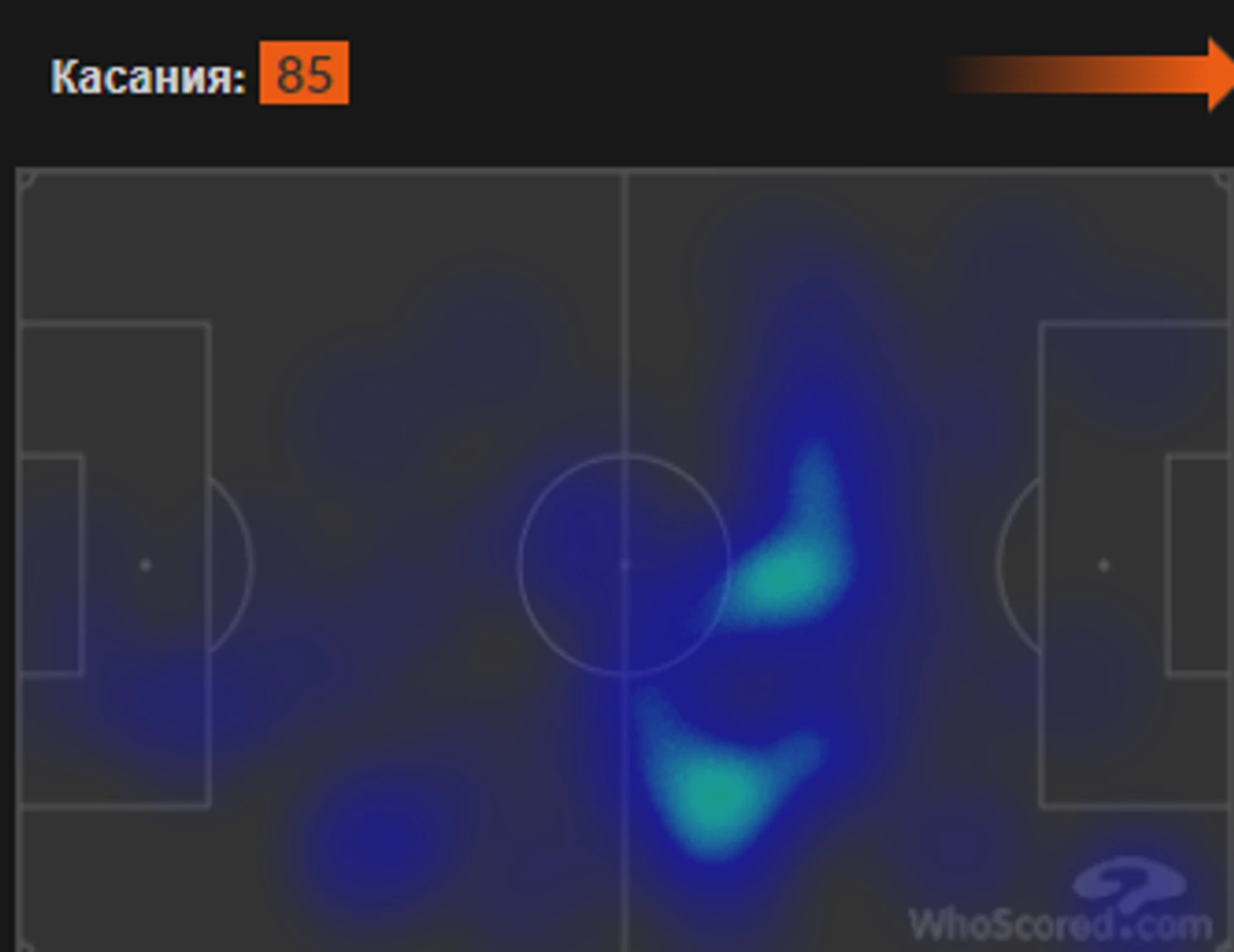 Тепловая карта в последней игре, хотя игрок номинально выходил как центральный атакующий полузащитник, видим, что часть игры смещался правее.