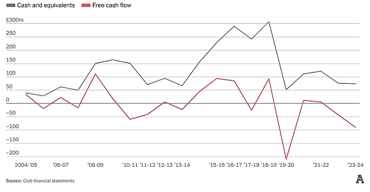 Существенной проблемой на «Олд Траффорд» долгое время оставалась простая вещь: нехватка «живых» денег. Манчестер Юнайтед всегда был клубом с высокой способностью генерировать денежные потоки, и, хотя они по-прежнему демонстрируют значительные операционные поступления (£121,1 млн в прошлом сезоне), траты на трансферы создают проблемы. Свободный денежный поток (FCF) клуба за последние годы резко сократился. FCF, по сути, — это сумма средств, остающаяся после капитальных расходов, которые для Юнайтед в основном связаны с трансферными выплатами.
