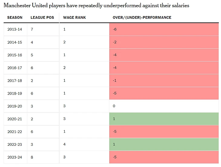 Говоря о зарплатах, расходы «Манчестер Юнайтед» снова увеличились в прошлом сезоне, хотя итоговая сумма в £364,7 млн оказалась ниже рекордных £384,2 млн в 2022 году. Однако утешения в этом мало: клуб выступил значительно хуже ожиданий, заняв лишь восьмое место в Премьер-лиге (и вылетев из Лиги чемпионов на самом раннем этапе), несмотря на третий по величине фонд заработной платы в дивизионе. Это уже второй раз за три сезона, когда «Юнайтед» финиширует на пять позиций ниже, чем место клуба в рейтинге зарплат.
