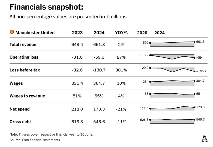 По оценкам The Athletic, убыток клуба в расчётах PSR за сезон 2023/24 составил около £43 млн. При текущем обменном курсе это оставляет клубу возможность понести лишь до £8 млн убытков в расчётах УЕФА, чтобы не превысить лимит в €60 млн. £35 млн расходов на приобретение акций в прошлом сезоне больше не будут учитываться в этом году, что позволяет клубу приблизиться вплотную к лимиту УЕФА — но становится очевидно, почему возникает беспокойство. В 2023 году «Юнайтед» уже нарушил прежние правила финансовой устойчивости УЕФА, предшествовавшие новому правилу «футбольных доходов», за что был оштрафован на €300 000.