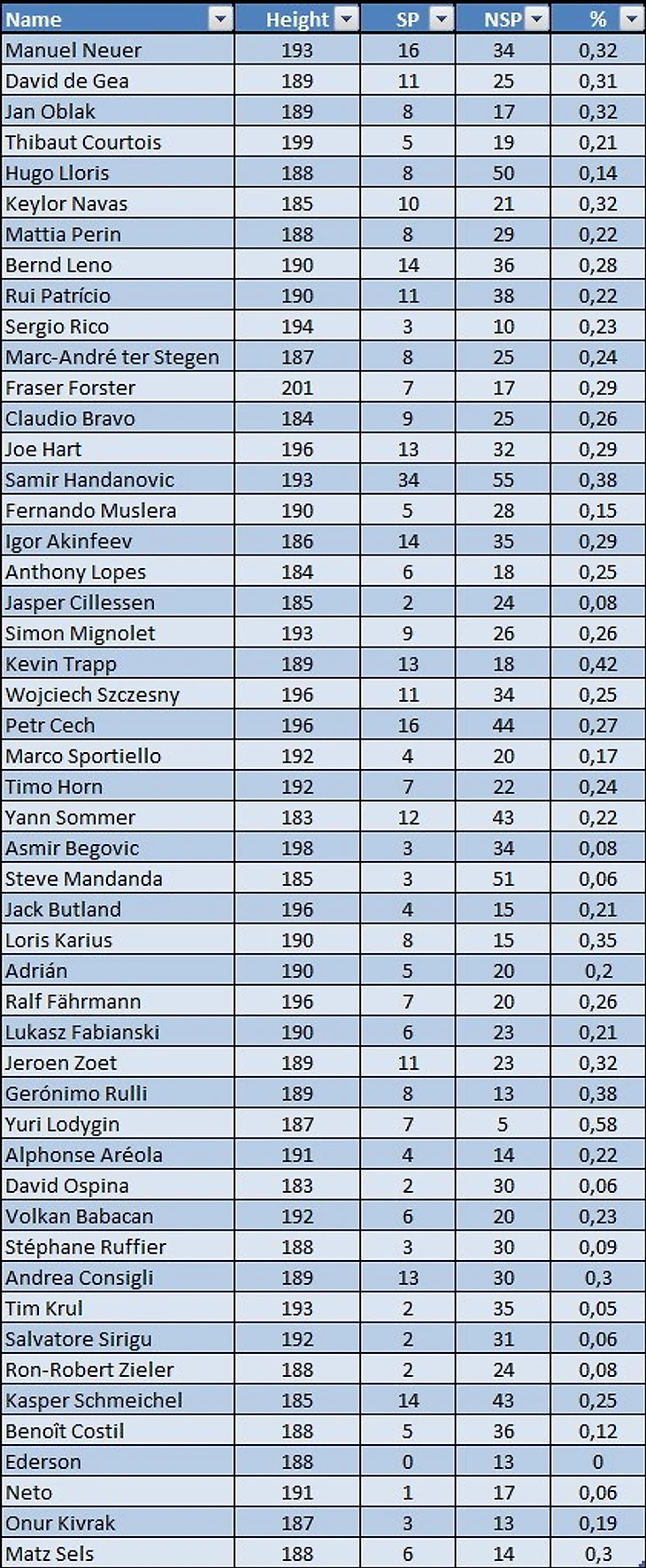 Начнем, пожалуй, с базы, на которую будем опираться. Ваш покорный слуга не поленился покопаться в статистике и подсчитать процент отбития пенальти среди ТОП-50 вратарей по стоимости от transfermarkt (наиболее удобный критерий для выборки, так как, за определенными исключениями, их можно назвать и лучшими на своих позициях в Европе).