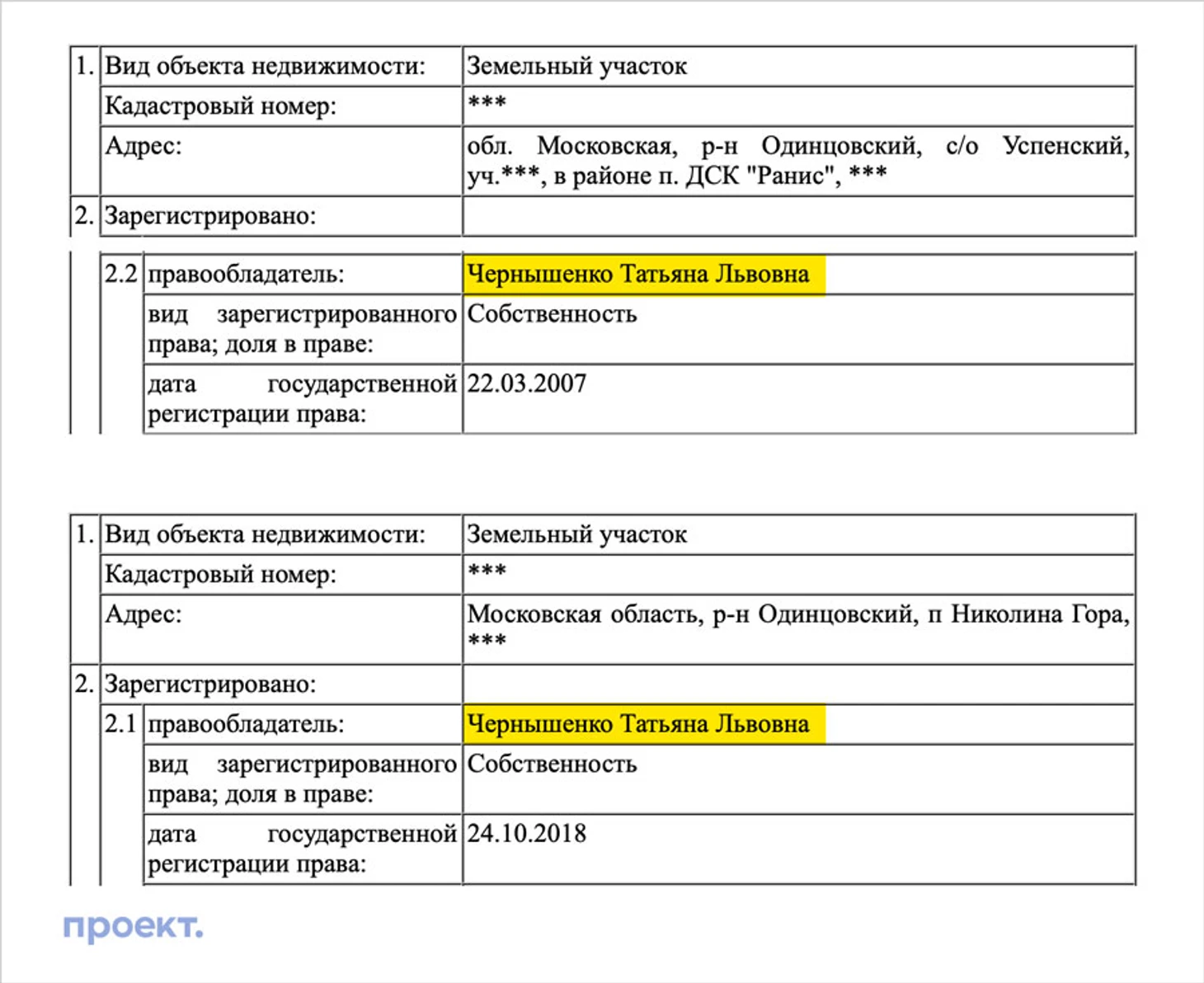 Кроме того, как выяснил «Проект» (сайт, специализирующийся на расследованиях), сейчас Мишустин и Чернышенко живут на Рублево-Успенском шоссе, в коттеджном поселке «Коттон Вей» на Николиной горе. Участки находятся на расстоянии 300 метров (в двух минутах ходьбы друг от друга). В обоих случаях земля зарегистрирована на родственников.