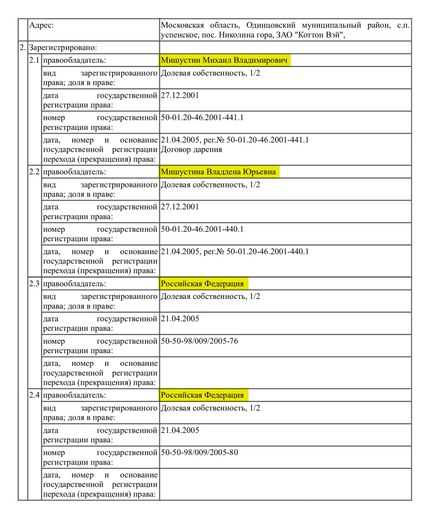 Владельцы участков Мишустина скрыты в Росреестре. Вместо имен в выписке указана «Российская Федерация» (так делают, когда хотят скрыть информацию о владельце).
