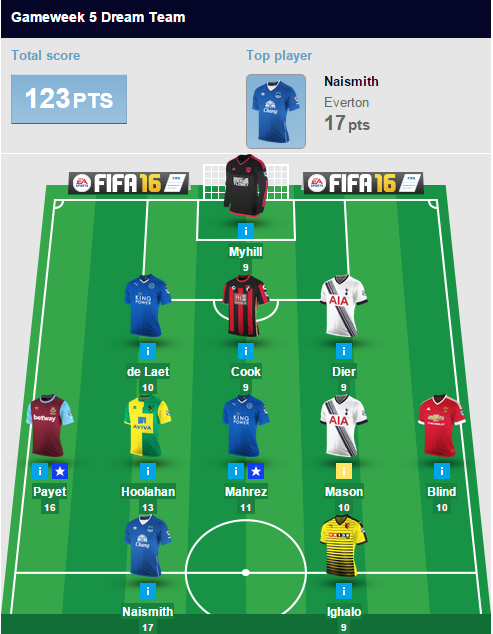 Мэйсон в отсутствие Эриксена взял на себя обязанности по построению атак «Тоттенхэма» и разразился голом, а его партнер Эрик Дайер отлично проявил себя в обороне. В команду мечты попали забивные защитники де Лат и Кук, был оценен и победный гол Игало.
