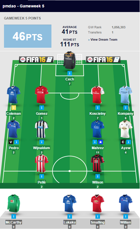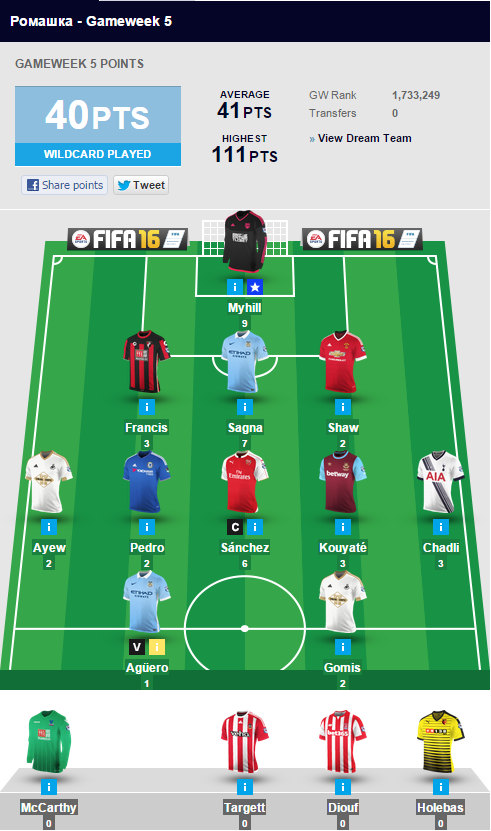 Использование wildcard пока не оправдывает себя, но окончательный вывод сделаю еще после 3-4 туров, ведь расчет был в долгосрочную. Историю про Куяте — Шадли вы уже слышали, про неудачи Санчеса и атаки «Суонси» тоже. О травме Агуэро вы уже успели погрустить. В общем, пока все печально, но я, конечно же, не отчаиваюсь.