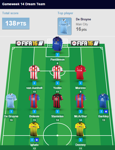 На этот раз команда вышла весьма забавная. В обороне — два крайних защитника «Сандерленда», в атаке — два форварда «Уотфорда», в полузащите — два хавбека «КП». Первые на двоих разобрались со «Стоком», вторые — с «Астон Виллой», третьи — с «Ньюкаслом». В списке лучших опять нашлось место Баркли, про де Брюйне, Морено и Станисласа уже шла речь. В воротах — Пантилимон, который помог Йедлину и ван Анхолту сохранить клиншит в матче с «гончарами».