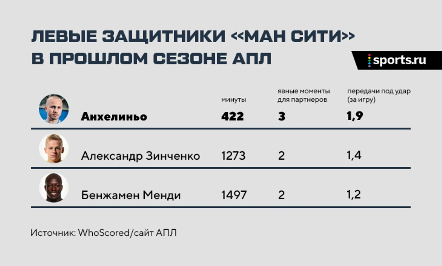 Зато есть забавные цифры. Несмотря на то, что в прошлом сезоне Анхелиньо провел в АПЛ в несколько раз меньше минут, чем Зинченко и Менди, он умудрился создать больше явных моментов. Даже если сжалиться над конкурентами и подсчитать, сколько передач под удар они отдавали в перерасчете на 90 минут, то и тут сравнение в пользу испанца.