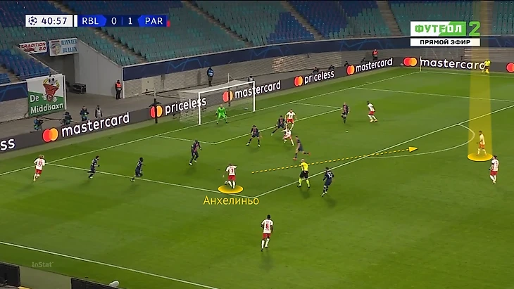 Второй случай – игра уже этого розыгрыша с «Парижем». Здесь опорники «ПСЖ» присоединились к защитникам, но оставили пространство в опорной зоне. Анхелиньо отдаст туда голевой пас на Кристофера Нкунку: