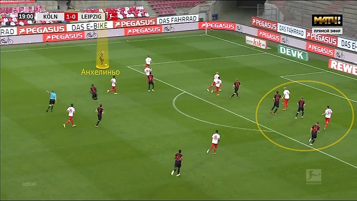 Ниже – пример из матча с «Кельном». Тут есть и свобода для Анхелиньо, и лишний игрок на дальней штанге. Эпизод завершится голом – испанец сделает результативный пас: