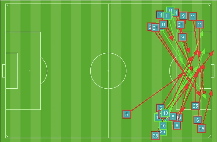 В общей сложности «Бавария» сделала 38 навесов за игру – это в два раза больше их показателя в Бундеслиге, где они, как правило, тоже сталкиваются с соперником, который паркует автобус. Важно, что сразу 10 из них дошли до адресата – очень неплохо против команды, которая буквально забивала игроками собственную штрафную.