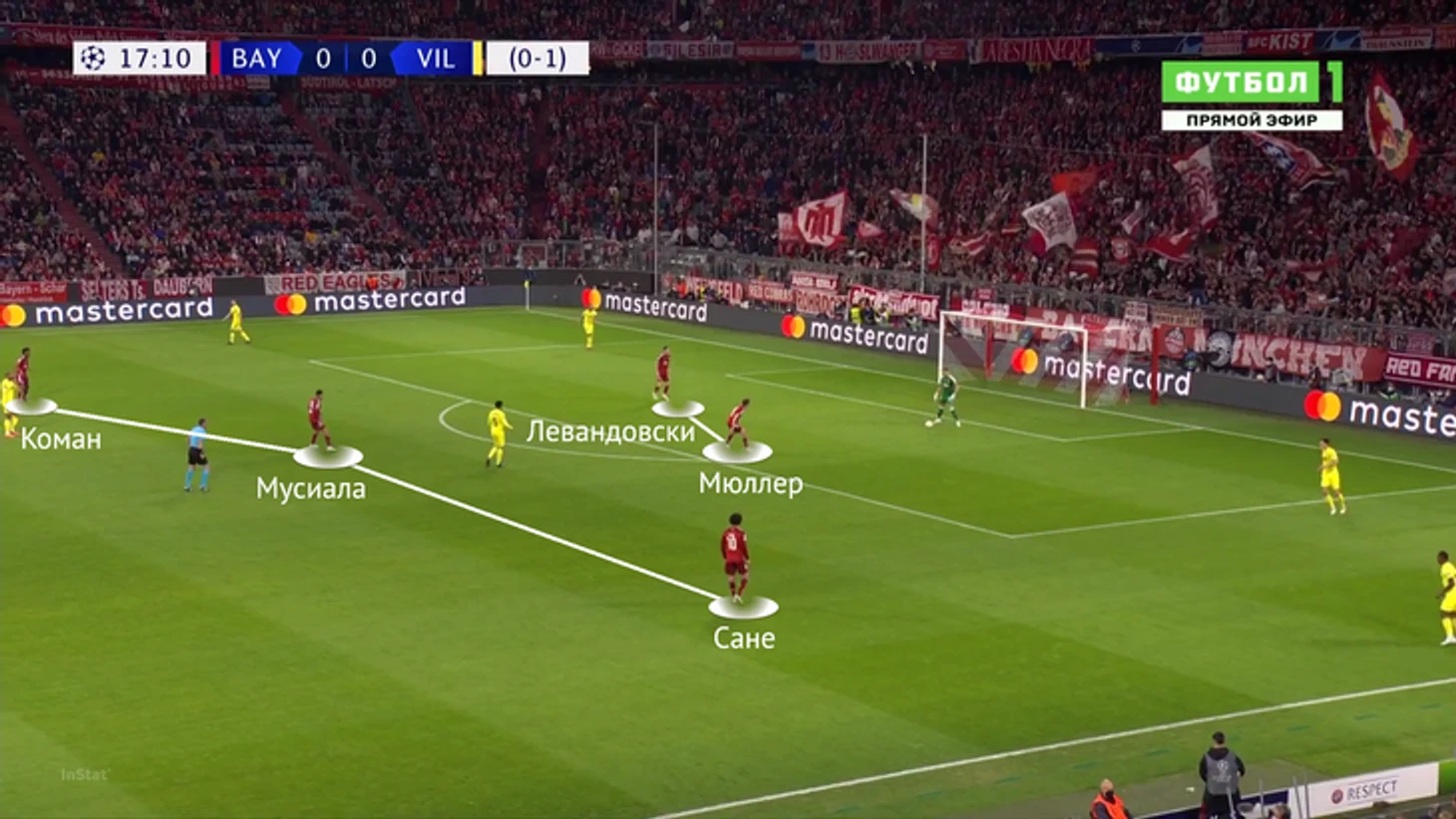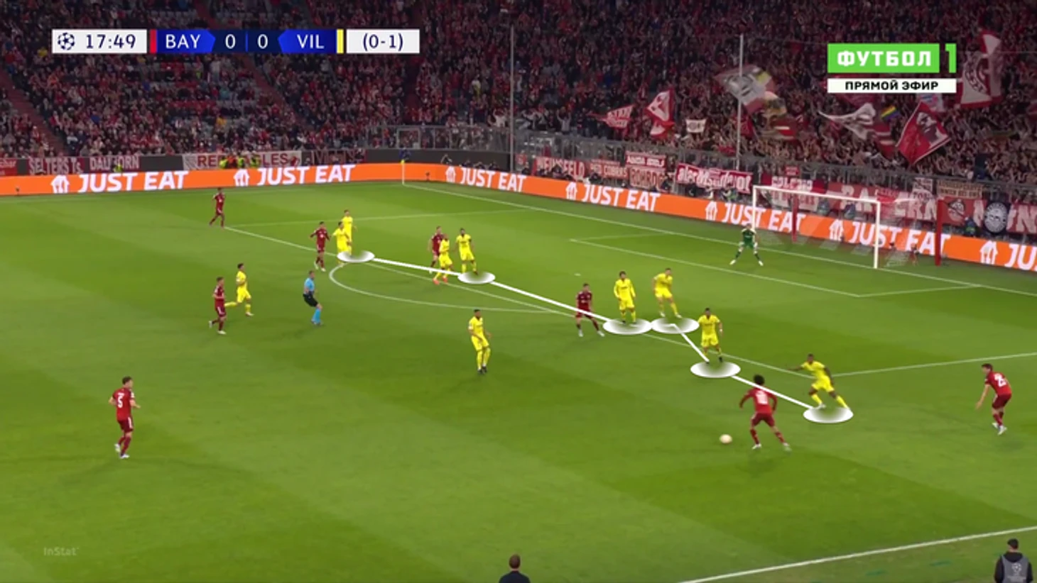 – в следующей линии располагалась тройка из Комана, Мусиалы и Сане – они перекрывали крайних защитников и опорников «Вильярреала»;