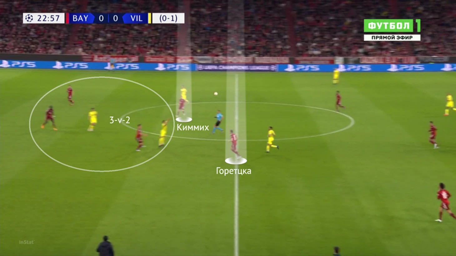 В ответной игре ситуацию радикализировал Нагельсманн. Выпустив Комана и Сане на флангах, Юлиан еще больше растянул оборону «Вильярреала» – теперь в последнюю линию садились не только опорники, но и вингеры гостей (Ло Чельсо – справа, Коклен – слева). На это пришлось пойти, чтобы Коман и Сане не оставались 1-в-1 с защитниками – в редких моментах, когда это происходило, они включали дриблинг (особенно хорош был француз).
